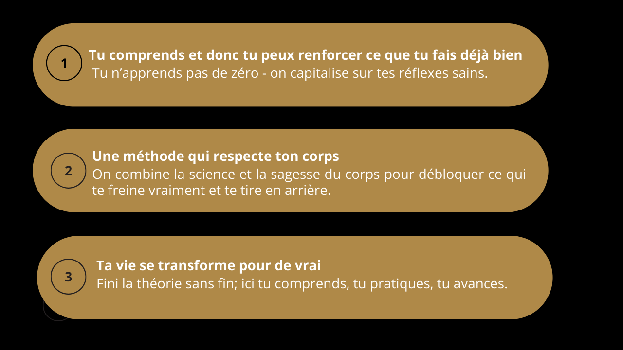 Ma méthode déclenche des déclics réels au lieu de t’encombrer de théorie interminable: on t’aide à désamorcer les freins inconscients qui t’empêchent d’avancer à ton goût.